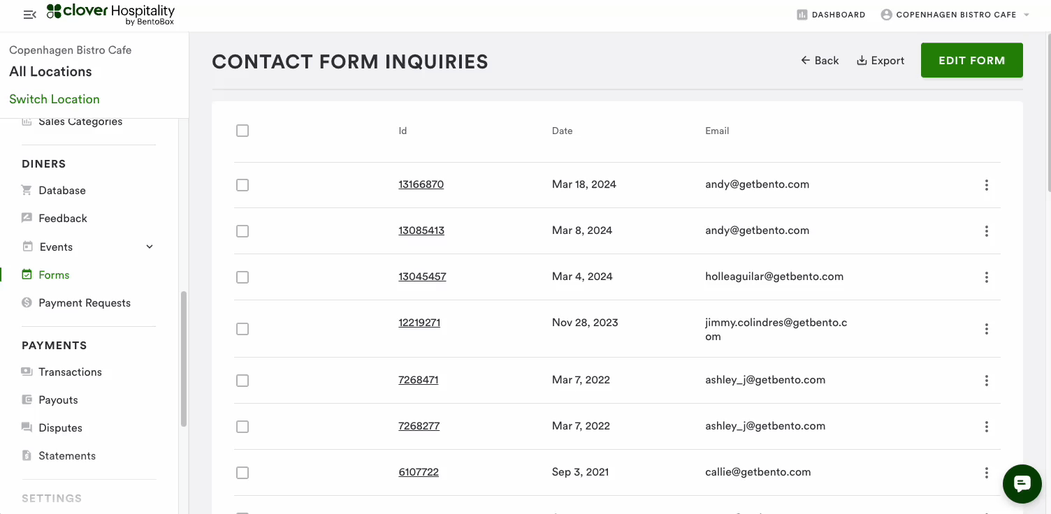 Navigate to Diners > Forms in the left-hand navigation in the backend.