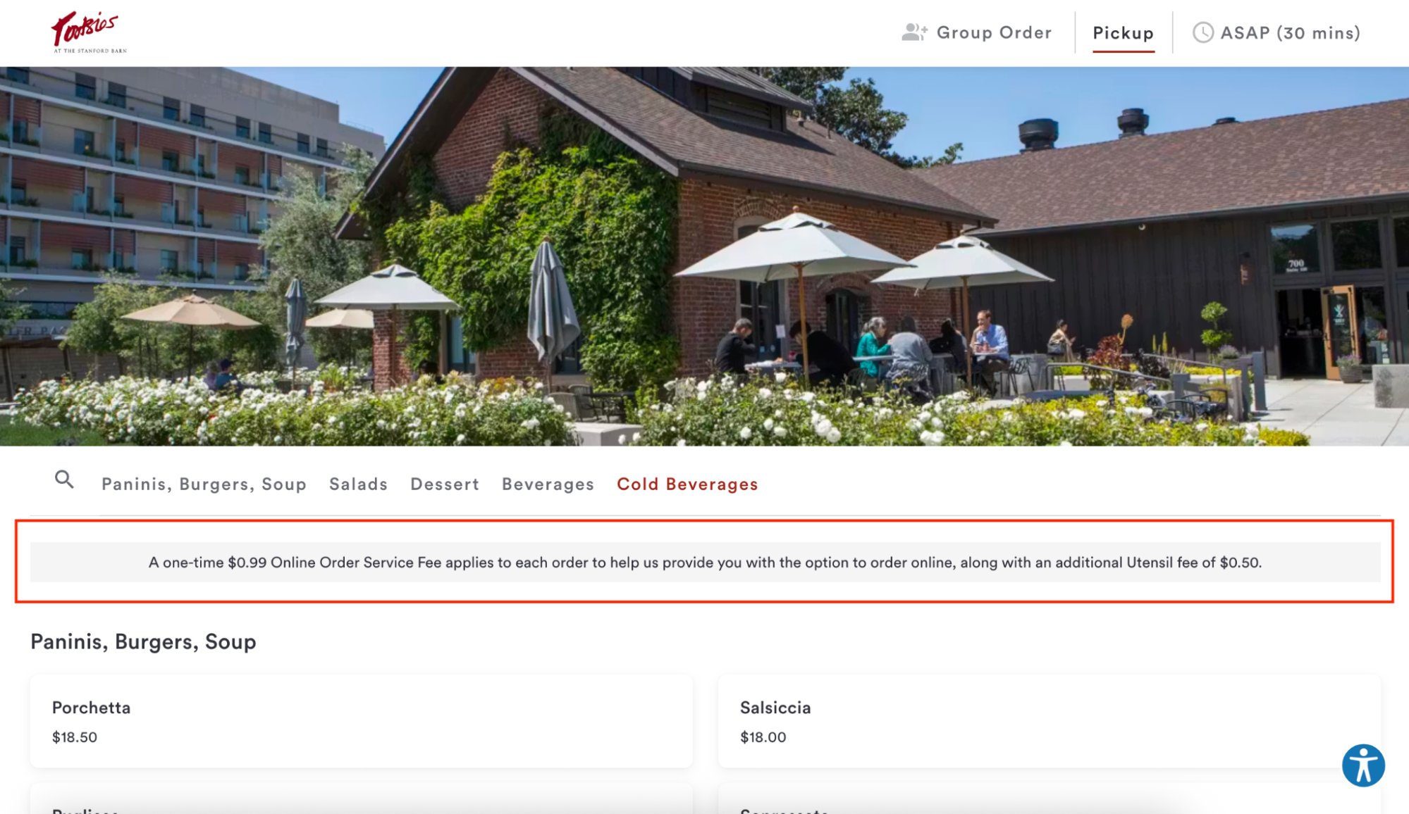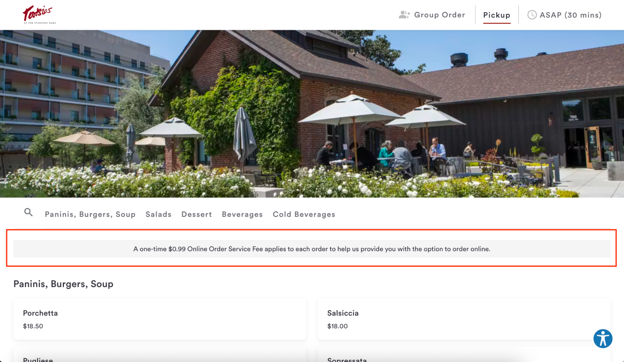 When enabled, the Fee Visibility toggle shows a banner on your online ordering or catering storefront that notes any service or additional fees that will be charged on the order. In addition, when a customer reaches the checkout screen, they will see taxes and fees broken out as separate line items, rather than combined in a single “taxes and fees” line. Merchants may use this feature to present fee information where required by applicable laws.Â