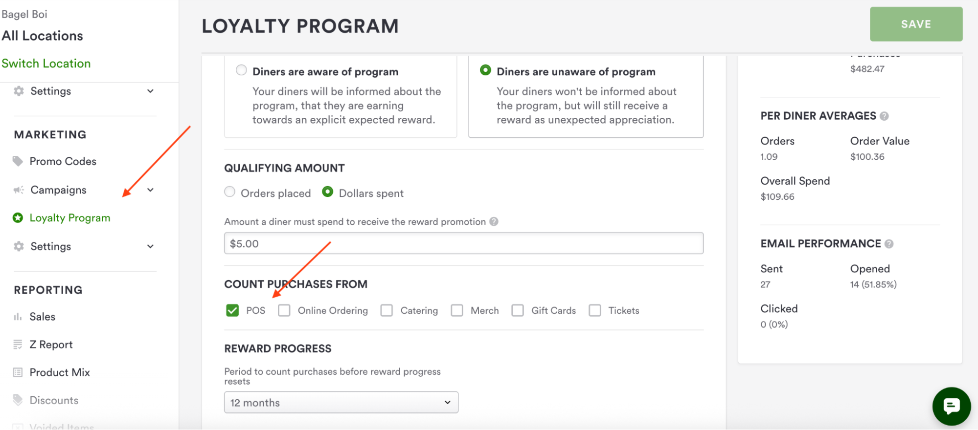 Loyalty settings can be accessed via the Marketing section. Here, you can set up a single loyalty program and apply it to as many products you like. You can make dollar-off, percentage-off, discounted item, and free item loyalty rewards. The POS box must be checked for diners to accumulate and use rewards on-premise. Read more about setting up the loyalty program here.Â