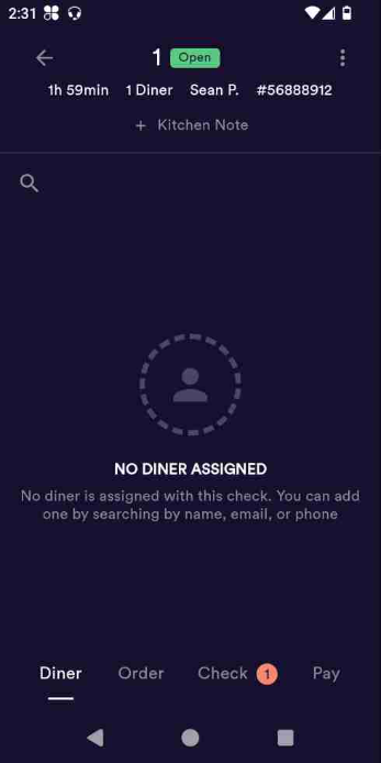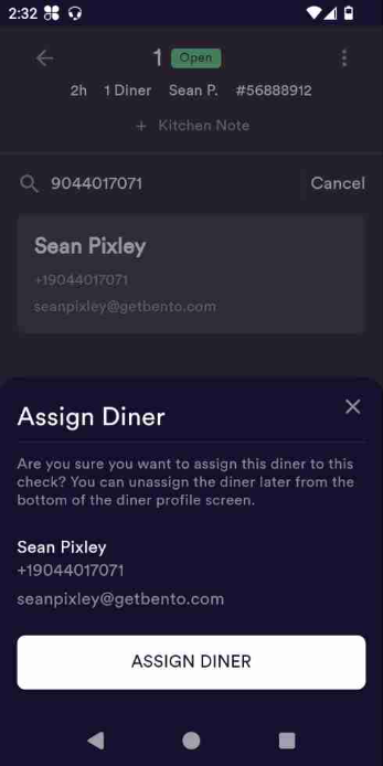Once a diner is found, you can confirm their information before assignment. You can only assign one diner to a table/check at a time.