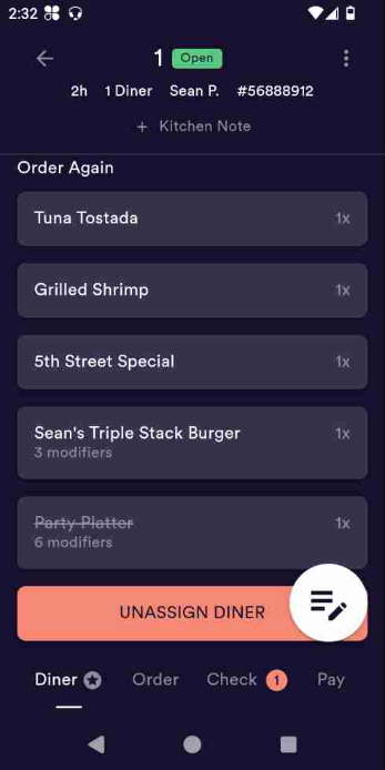 The “Order Again” view, along with the option to unassign a diner if desired.