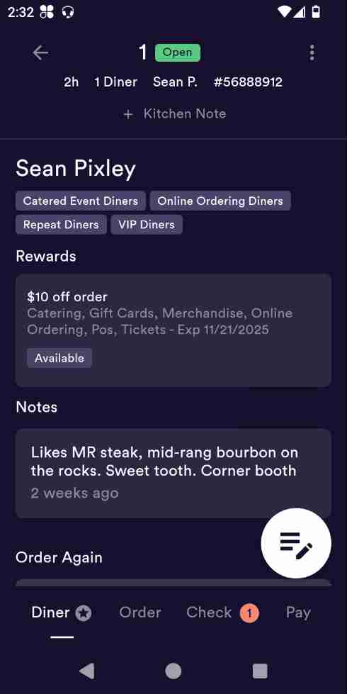 Below rewards are the customer notes added by the staff, via the reservations platform or the notes section of the diner database profile. The “order again” section below shows the customer’s order history, an easy way to quickly reorder favorite items.