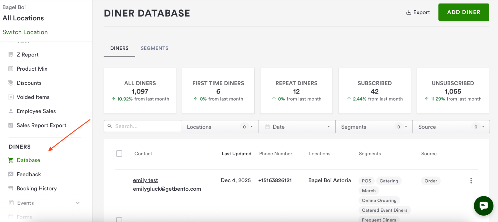 The POS will recognize diners that exist in the diner database in the Clover Hospitality backend. This section can be found on the main dashboard screen by scrolling to the “Diners” category and selecting “Diner Database.” Diners are added automatically via multiple methods: when they enter their information for a POS check, order online with Clover Hospitality e-commerce stores, make a Clover Hospitality reservation, or submit forms on your Clover Hospitality website. You can add diners as well, either individually or via bulk upload.Â