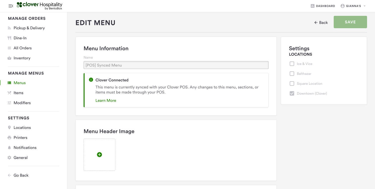 To use Clover with online ordering, you have to sync your point of sale (POS). With all POS synced menus the information moves in one direction. All changes need to be made within the POS and synced to Clover Hospitality by BentoBox. You can delete and even clone POS synced menus, but you cannot create new POS synced menus in your dashboard.