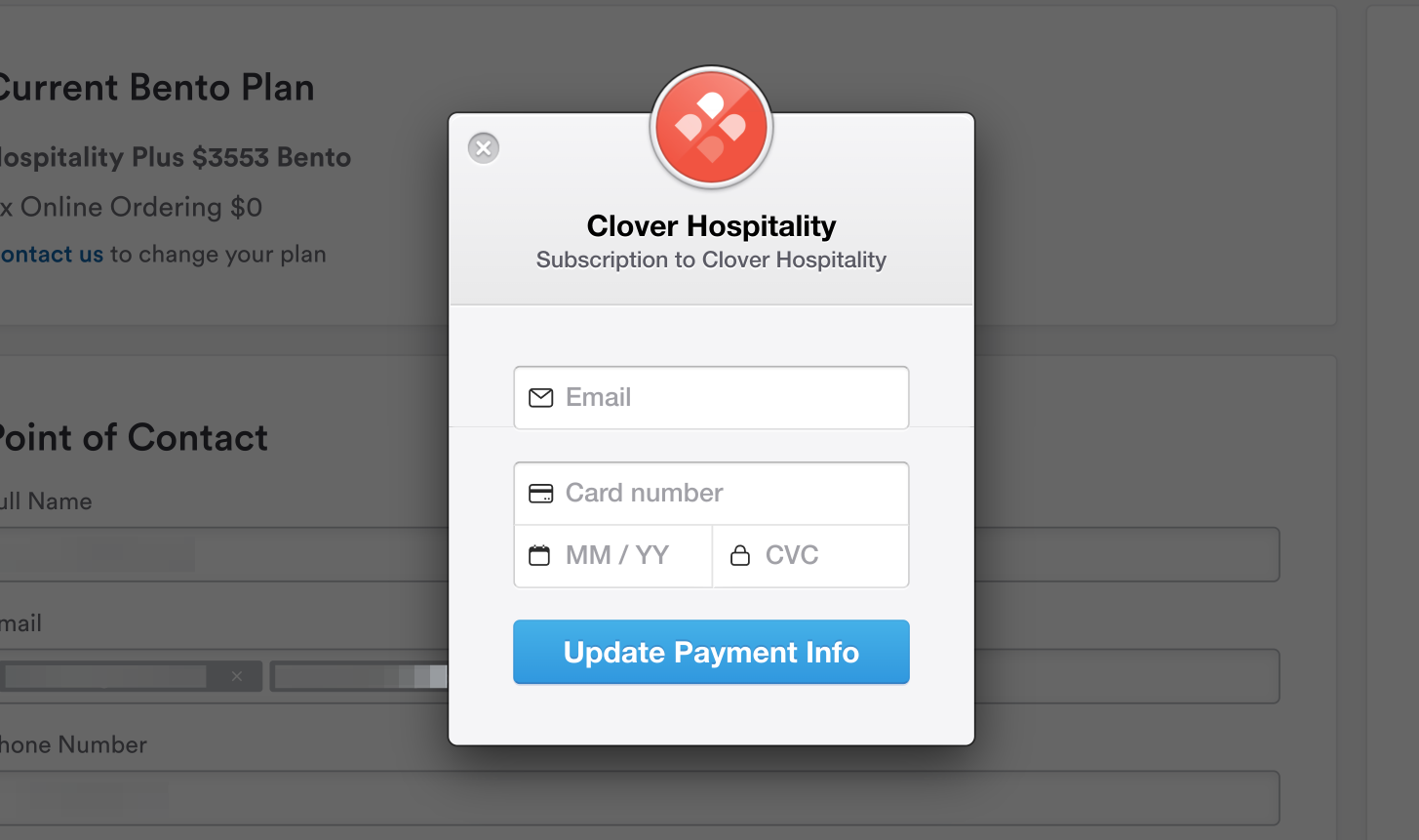 At the top of the page is the current plan information, including your payment amount and frequency. If you need to update your payment information, click the gray “Update Payment Info” button and a payment window will appear where you can update your credit card information.