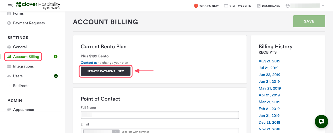 To view and update the current plan and method of payment, log in to the backend and locate the Account Billing tab under Settings in the left-side navigation.
