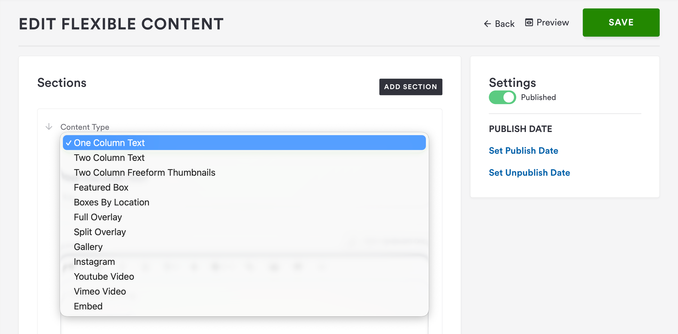 A flexible content box will appear. Click on the Content Type dropdown and choose one of the available options.