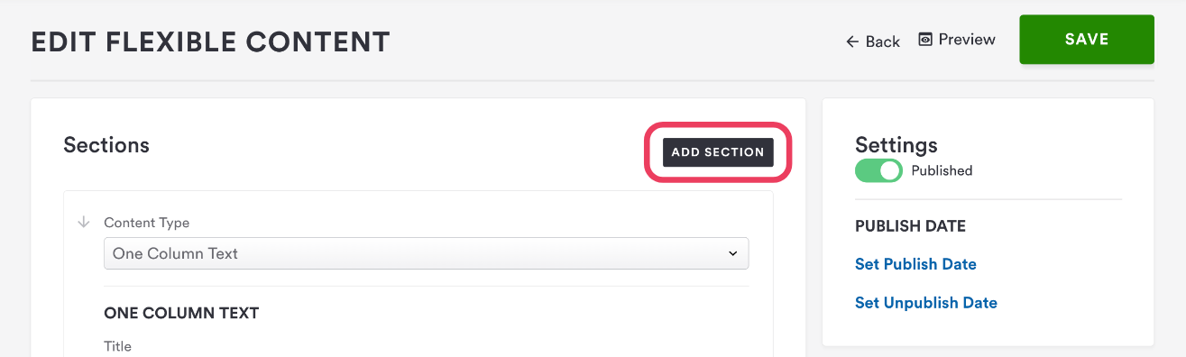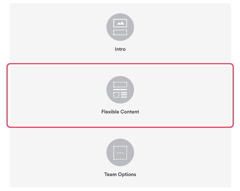 Some pages allow for adding flexible content. Flexible content is a page element that allows various types of content to appear on a page. Follow the steps below to add or edit flexible content.