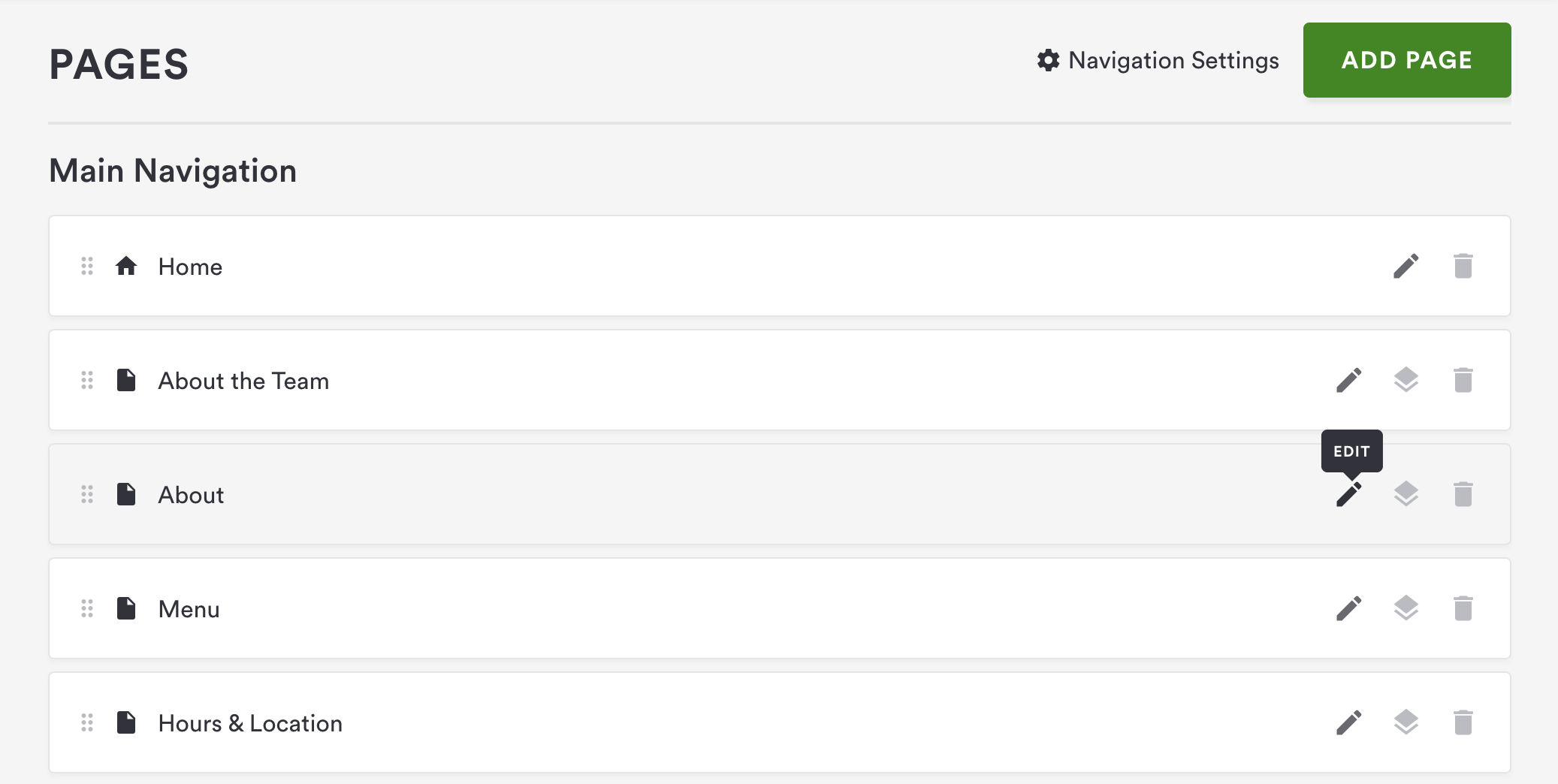 Hover over the page for which you’d like to add or edit the flexible content and click the edit icon that appears. Note that not all pages support flexible content.