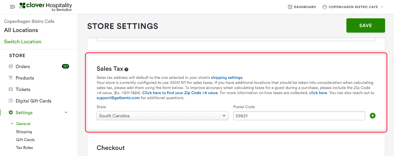How does Clover Hospitality by BentoBox know which taxes to calculate from my eCommerce store orders?
