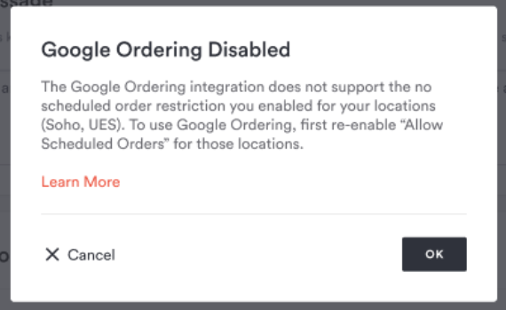 Google requires you to have Later ordering enabled to use the Google Ordering integration. If you toggle ‘Allow Scheduled Orders’ in your Online Ordering location to off, this means that you will not be able to receive orders from Google Search and Maps. To use Google Ordering, you must re-enable ‘Allow Scheduled Orders’ for your locations. Learn more about disabling later orders here.