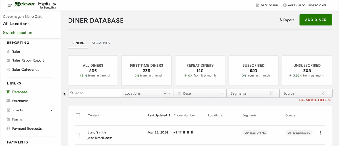 To look at individual diner profiles, go to your Diner Database. Diner Database allows you to keep a comprehensive look at all your diners in one place, leveraging diner metrics and introducing segmentation to our platform.