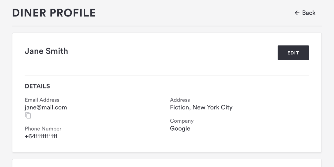 For each Diner Profile, you’ll see a section at the top with the Diner’s details, which includes: