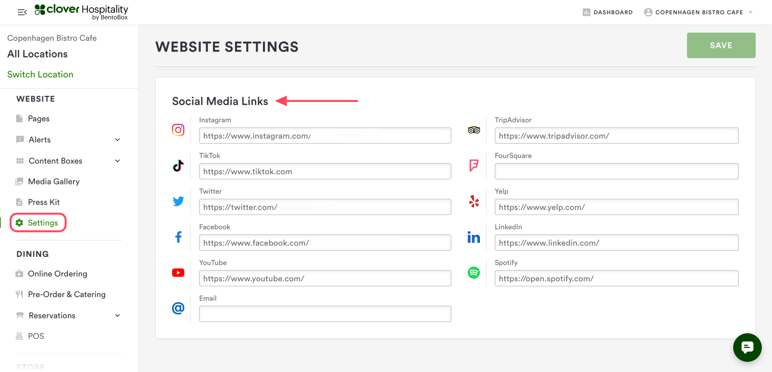 Clover Hospitality by BentoBox allows you to add Twitter, Facebook, Instagram, TripAdvisor, Spotify, LinkedIn, Foursquare, Yelp, Google Plus, YouTube, TikTok, and email addresses icons directly on your website.