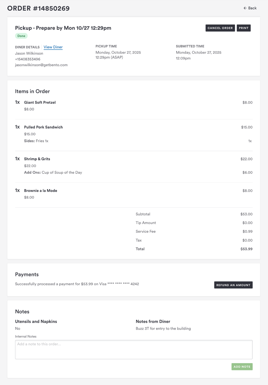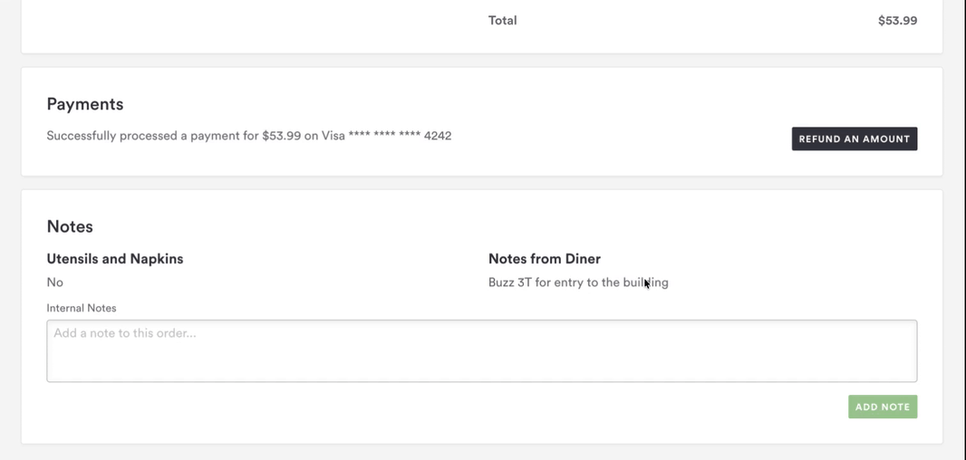 Notes can be added internally by your staff (i.e. “called in to ask for extra ketchup”) or entered by your guest during checkout (i.e. “not too greasy with the veggie side, please!”)Â