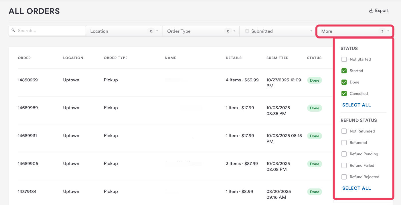If you want to filter to a specific location, date range, or fulfillment type, you can do that at the top of the page. You can also use the Order Status and Refund Status filters to locate all active and completed orders.