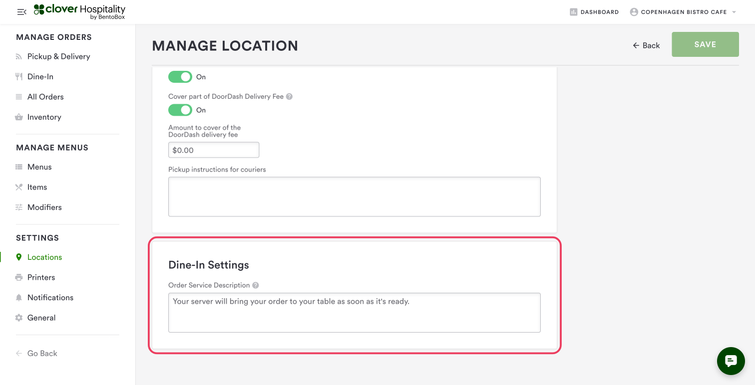 Once Dine-In is enabled, at the bottom of the settings screen there will be a new âDine-In Settingsâ section, with space for you to enter an Order Service Description, which lets you customize the copy guests will see in email receipts and on the receipt page.