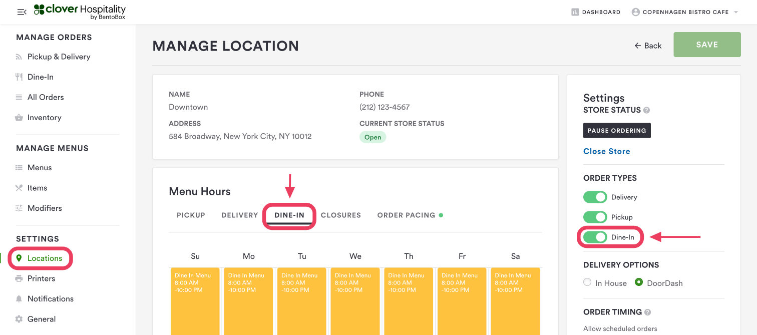 Before guests can place dine-in orders, you need to set Dine-In menu hours for the times youâd like to offer dine-in ordering. You can add hours by logging into the backend and going to Online Ordering > Locations > Edit Location > Dine-In.Â