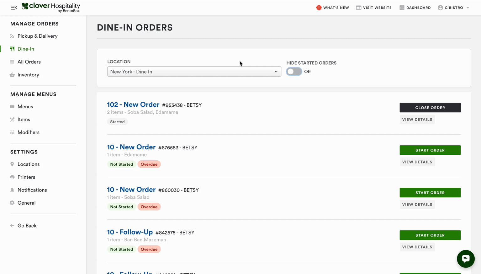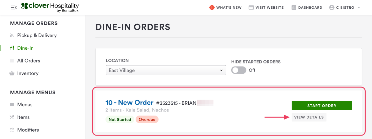 Location: If you use Dine-In Ordering at multiple locations, you can use the location dropdown to filter to the Dine-In orders view for each location. Only one locationâs Dine-In orders will display at a time.