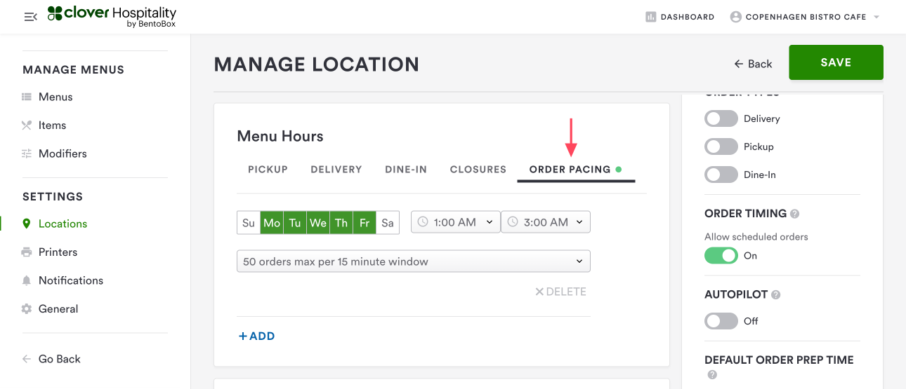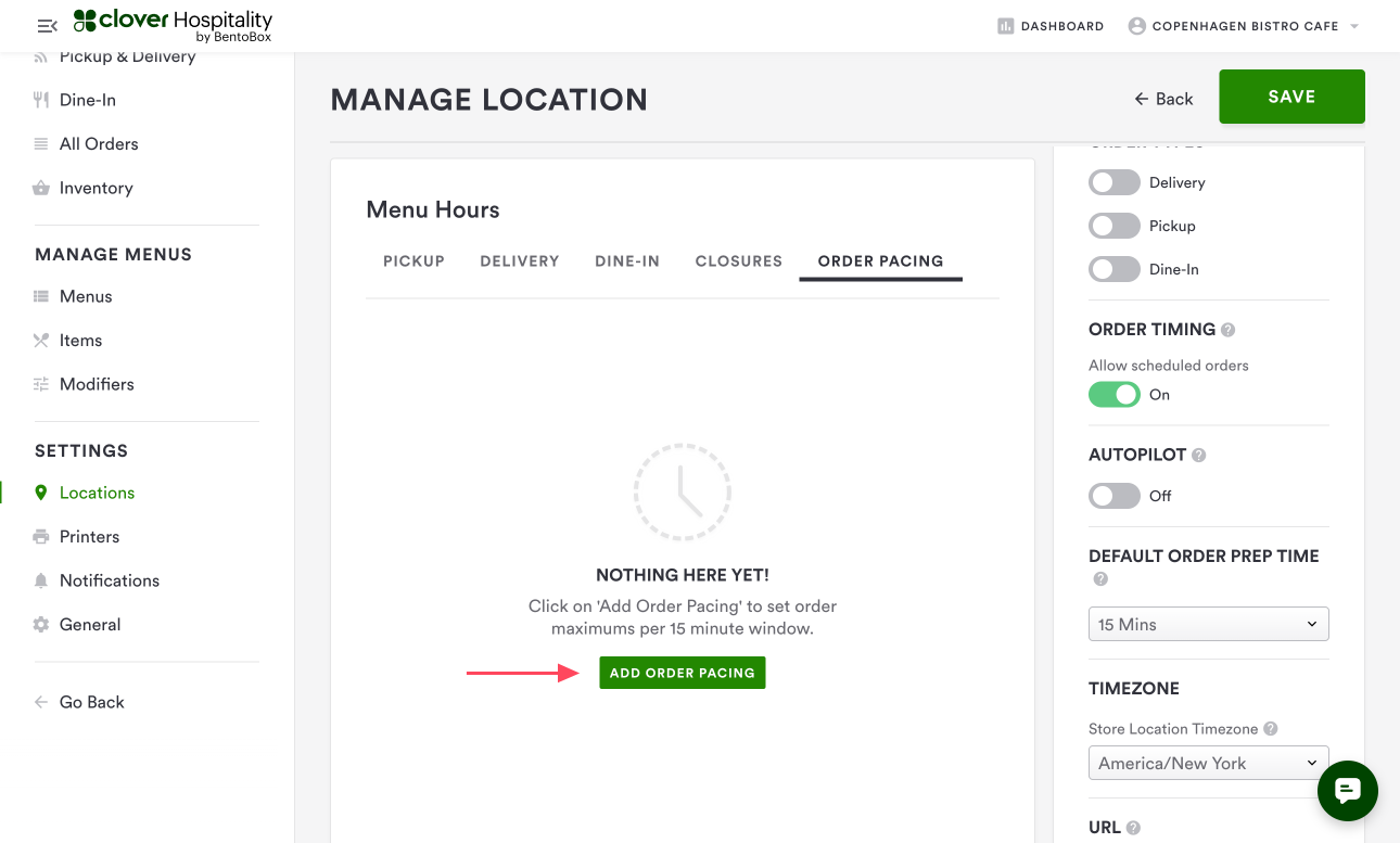 Order Pacing is a feature of Online Ordering that gives restaurants the ability to set a cap on the number of orders that can be fulfilled per 15-minute time slot, on a recurring basis by day-of-week and time-of-day.