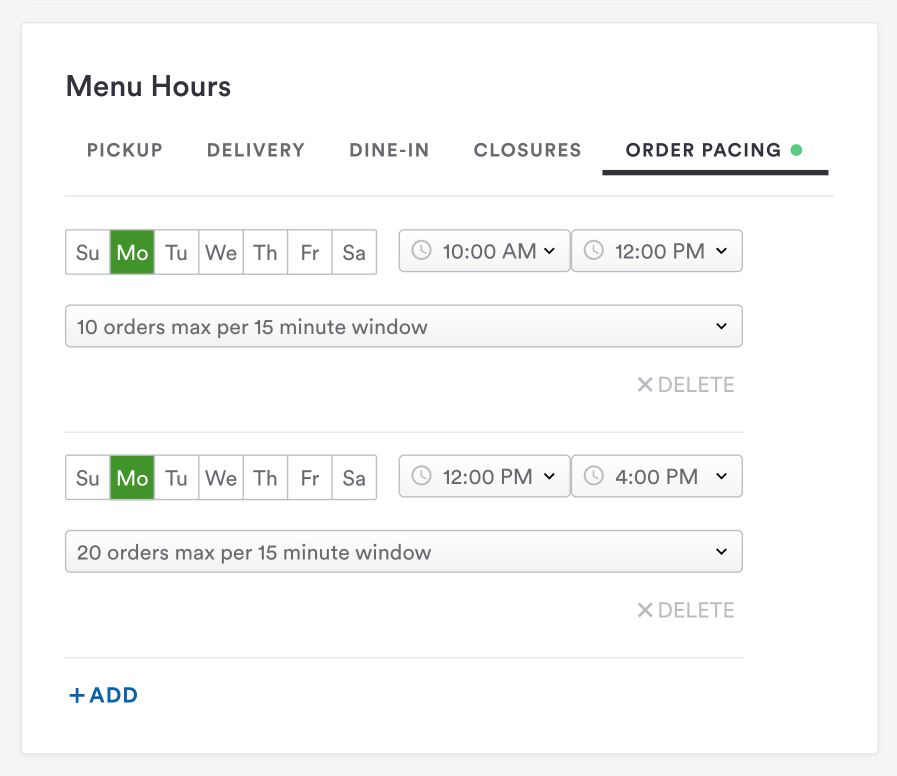 This applies to pickup and delivery orders. So, keep in mind that if you are a restaurant with both fulfillment types active, your pacing maximums will apply to both of these order types.Â