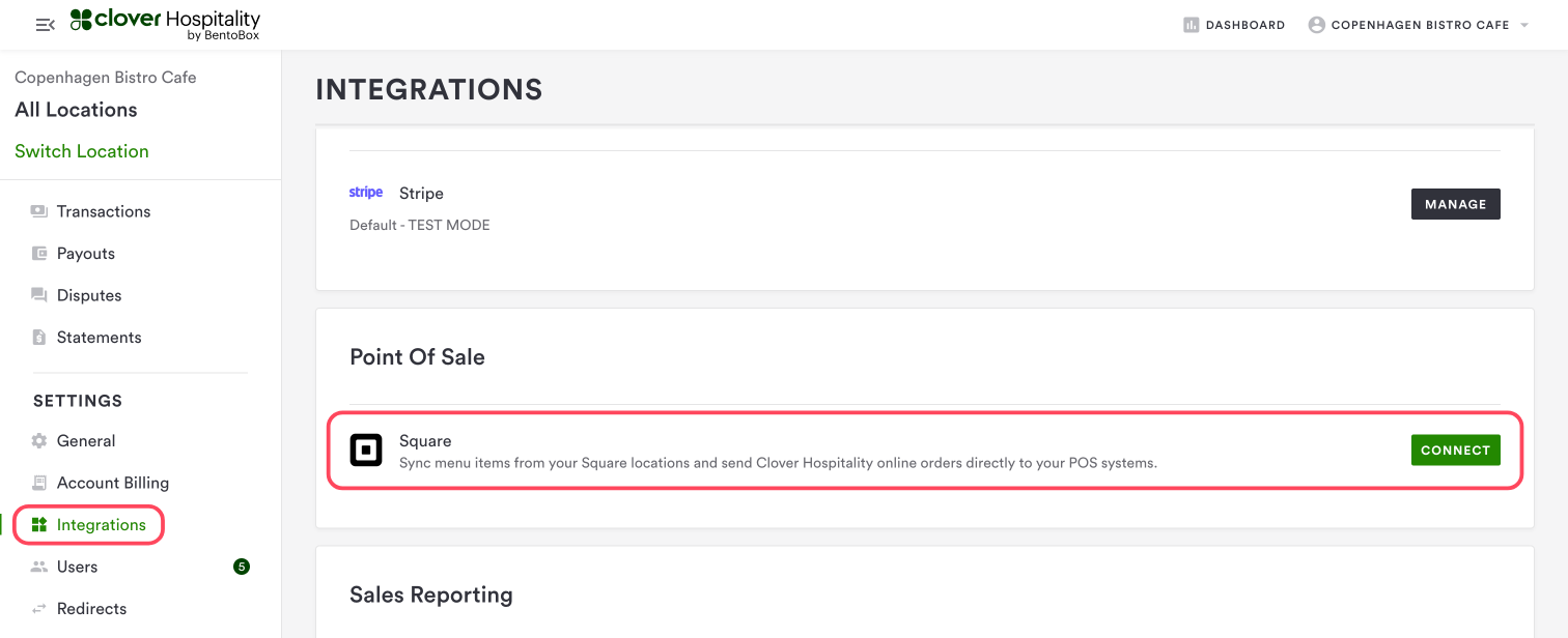 To use a Square POS integration, you must first have an active Square account that can accept payments connected to the backend. Click here to learn how to connect your Square account to Clover Hospitality by BentoBox.