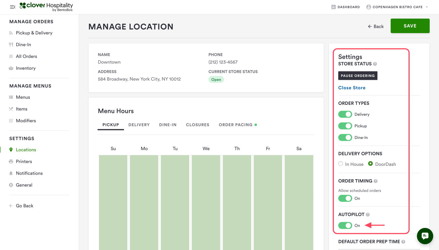 Go to STORE > Online Ordering > Settings > Locations > Click "Manage" for the location you wish to connect > You'll see an option on the right that says "AUTOPILOT" — toggle that "On."