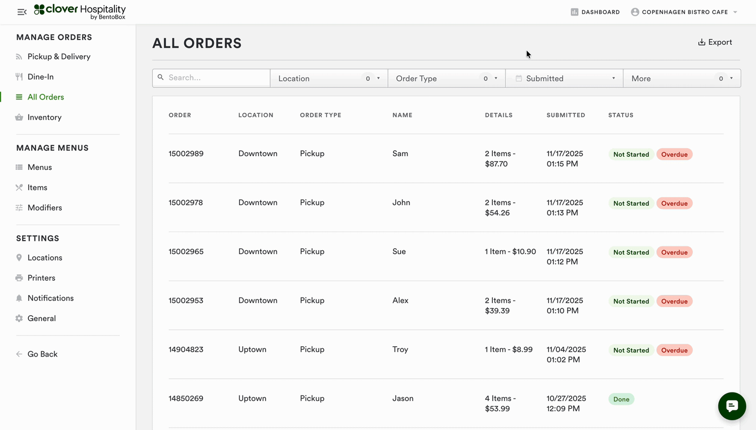 Source: All Online Ordering orders will appear as the source “Clover Hospitality by BentoBox”