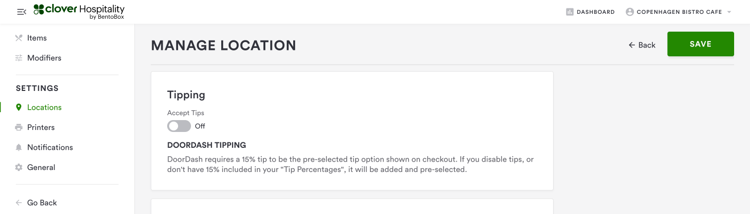 Tipping can be turned on or off, and will apply to all order fulfillment options in (pickup, delivery, and dine-in).