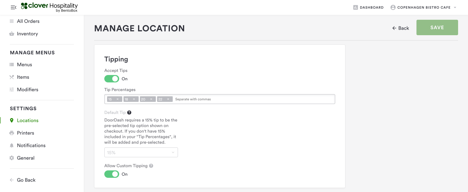 Allow Custom Tipping: whenever this toggle is on, diners can enter a custom percentile amount at checkout other than the preset values.