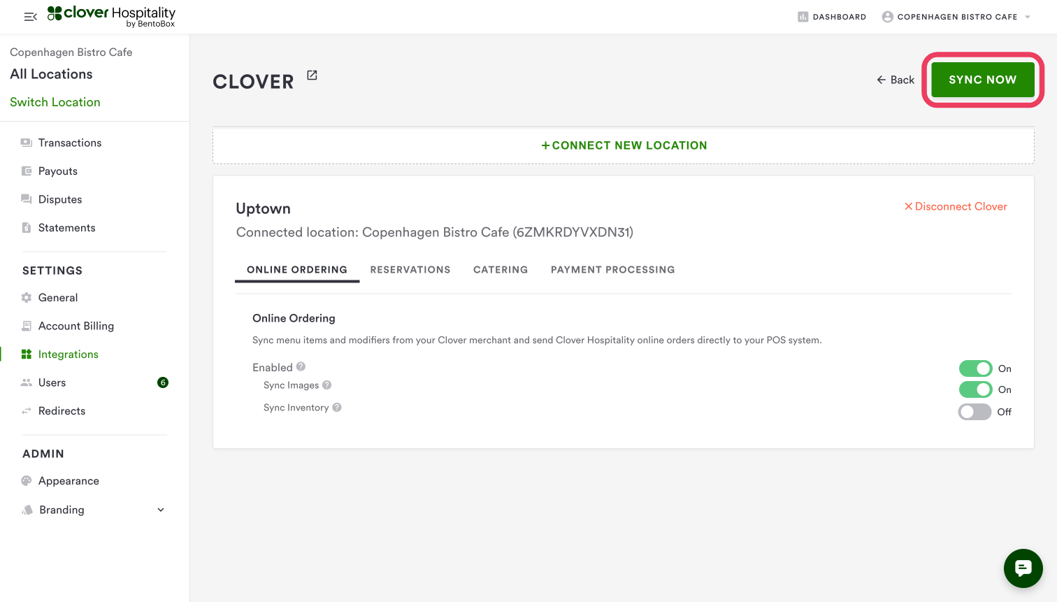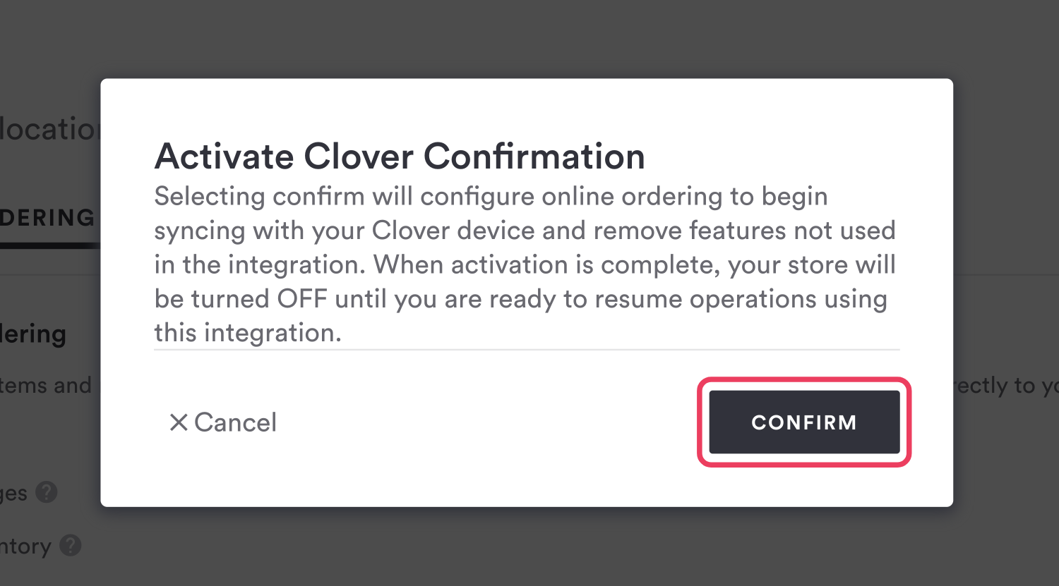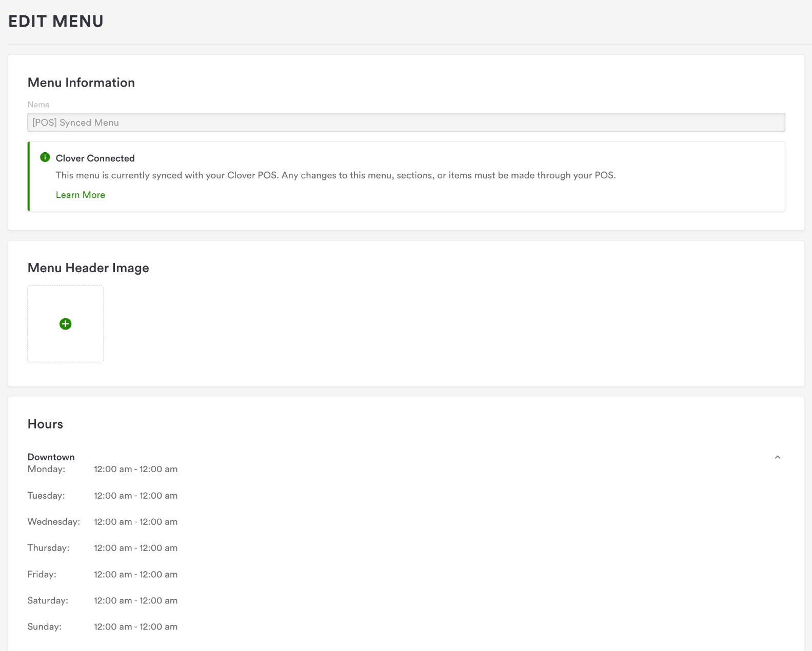 Note: When setting up this integration, we recommend turning off your store temporarily or go through these steps outside of your operating hours. Once you connect Clover, any Catering menus previously set on will disappear and your Clover menus will sync with the platform and the synced items from Clover will need to be added to newly created menus within your account.