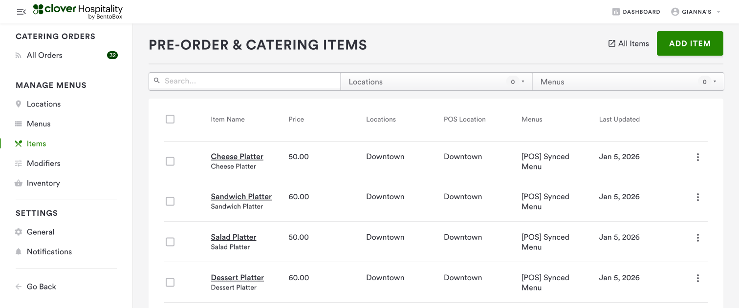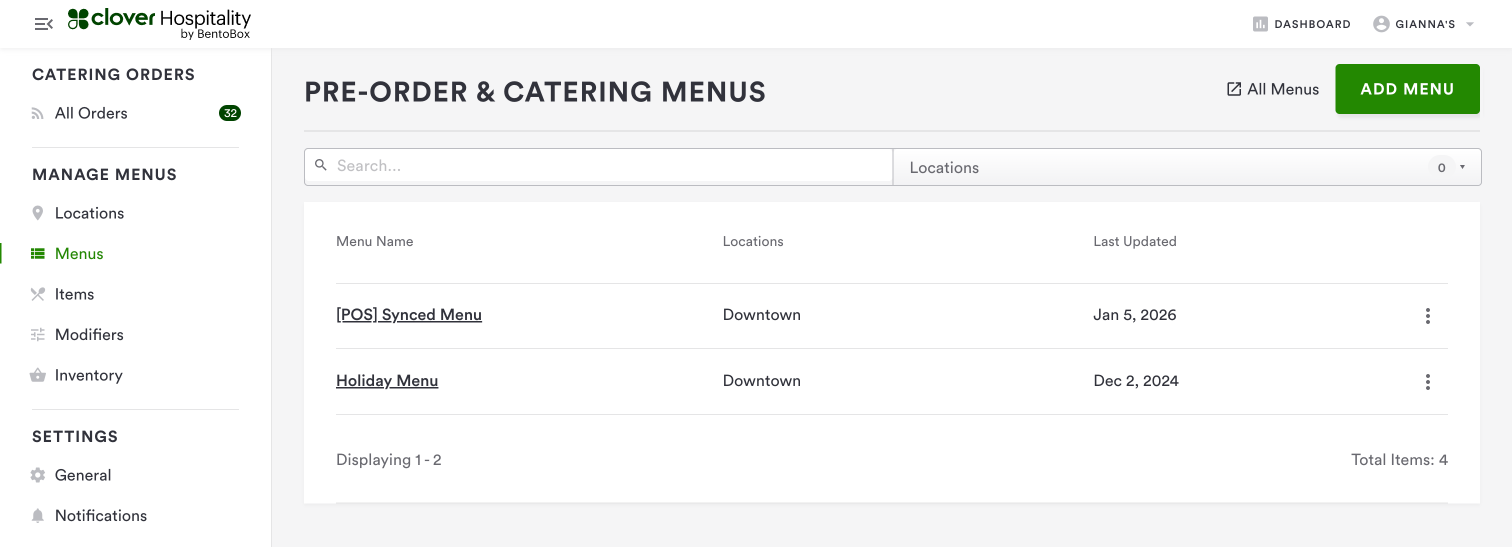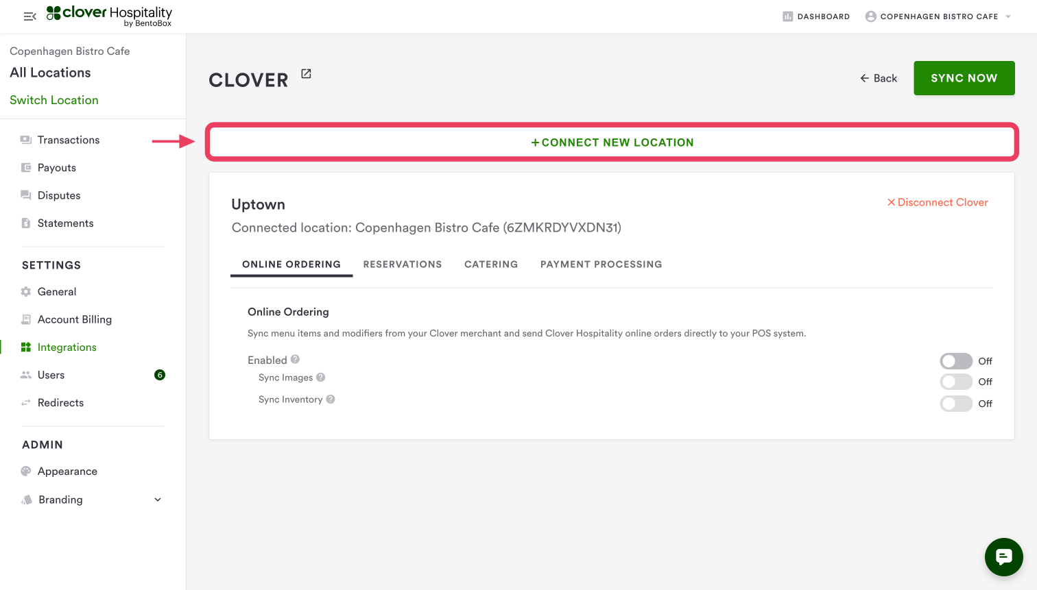 Note: When setting up this integration, we recommend turning off your store temporarily or go through these steps outside of your operating hours. Once you connect Clover, any Catering menus previously set on will disappear and your Clover menus will sync with the platform and the synced items from Clover will need to be added to newly created menus within your account.