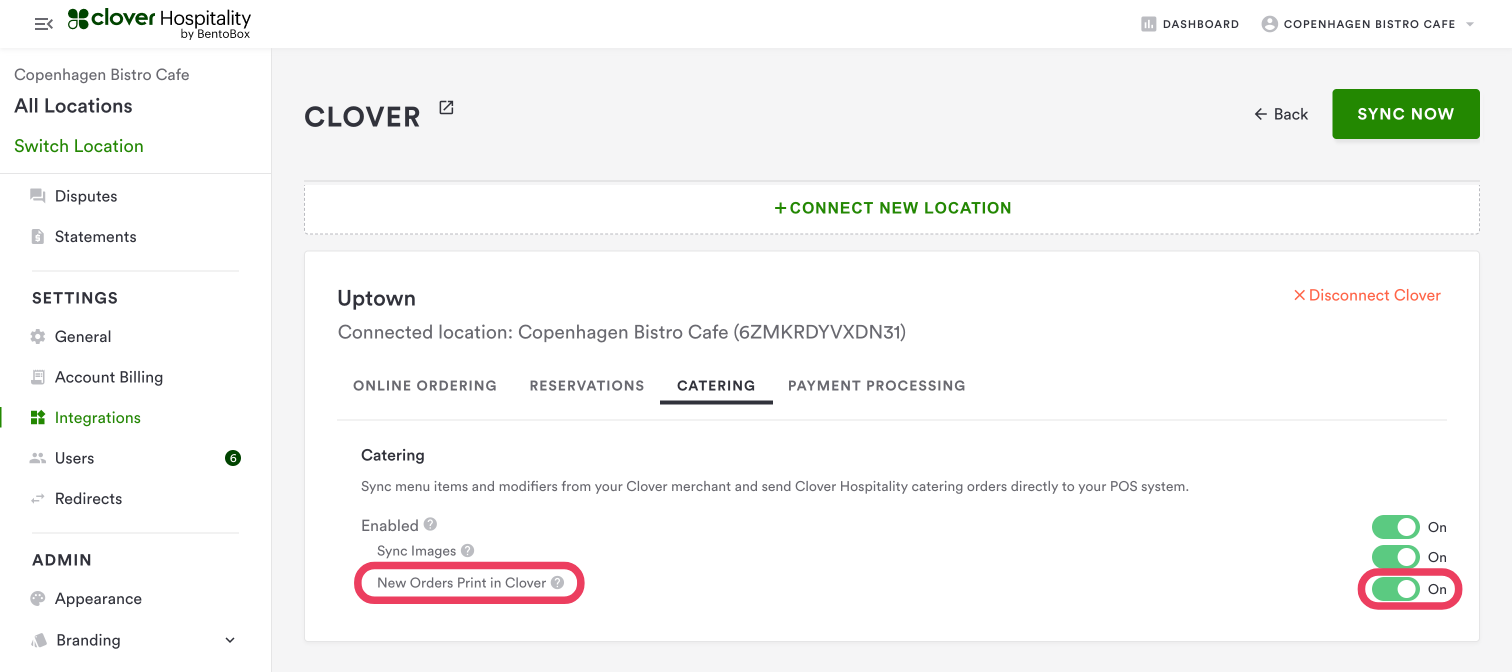 If "New Orders Print in Clover" is toggled on, orders will print via your POS at the time the order is placed. If toggled off, orders can be manually printed via Clover or Clover Hospitality by BentoBox.