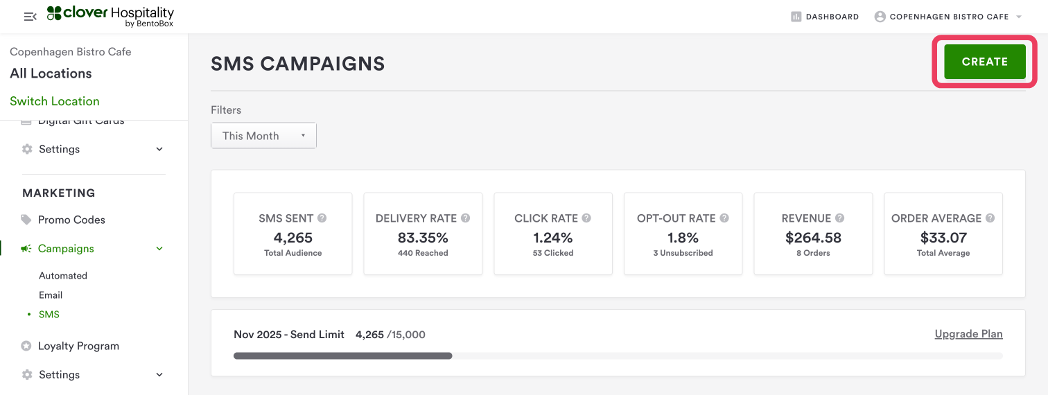 Revenue - The revenue and order number attributed to an SMS Campaign if it contains a Clover Hospitality by BentoBox link.