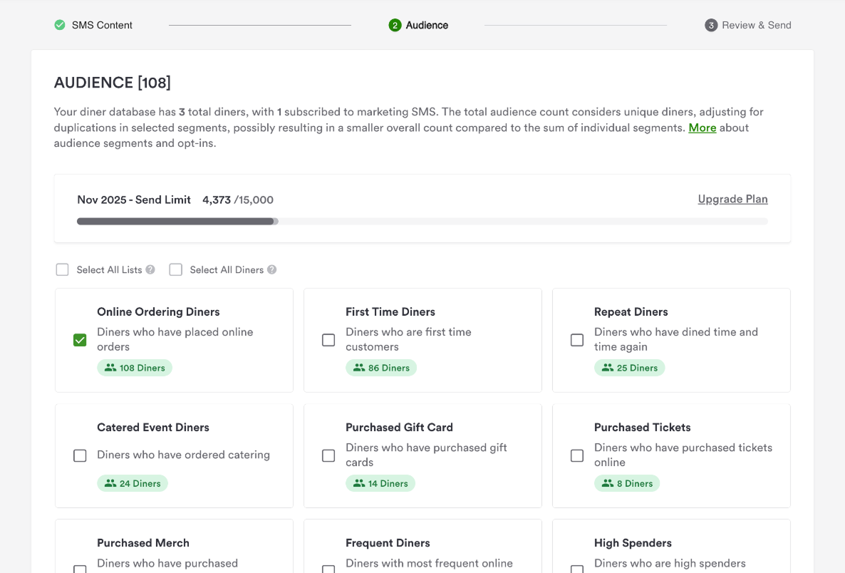 Checking the Select All Lists box will select diners segmented in any list, not necessarily all diners in your database. Those who have opted out of the SMS marketing will not receive a SMS.