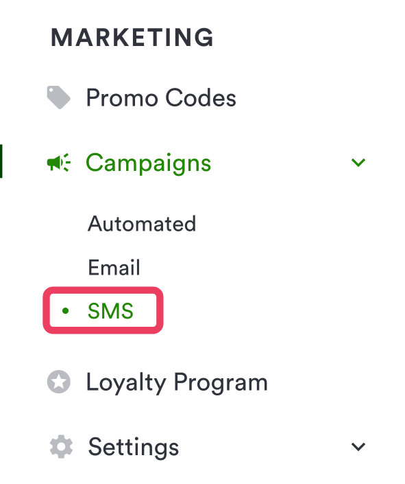 Navigate to the backends' dashboard, and click on the Campaigns > SMS tab in the Marketing section of the main navigation.