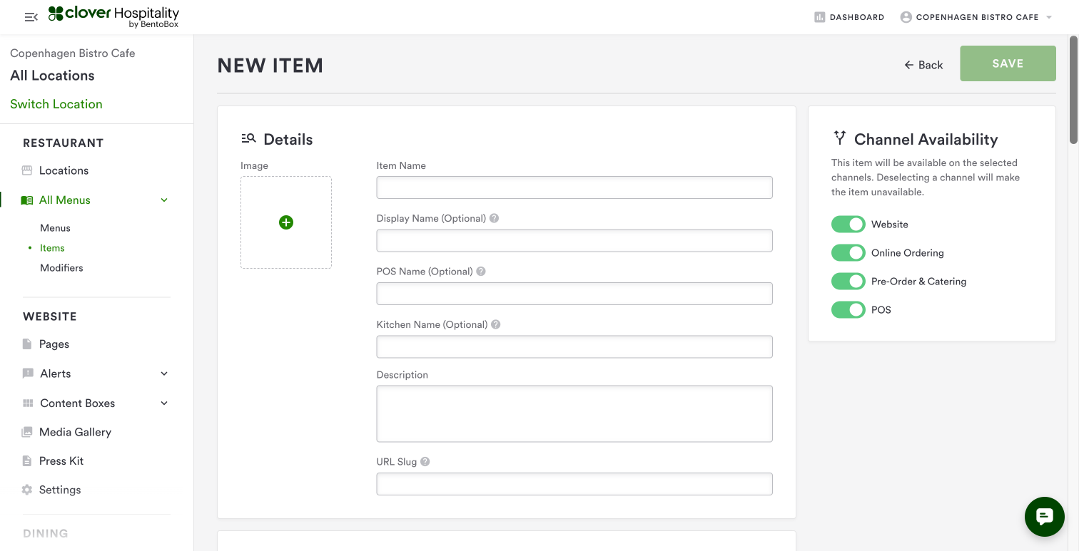 Channel Availability will not populate this new item on Online Ordering or Catering stores. This will allow you to access this item in the applicable dashboard to then add to your stores separately. Learn more about Channel Availability here.