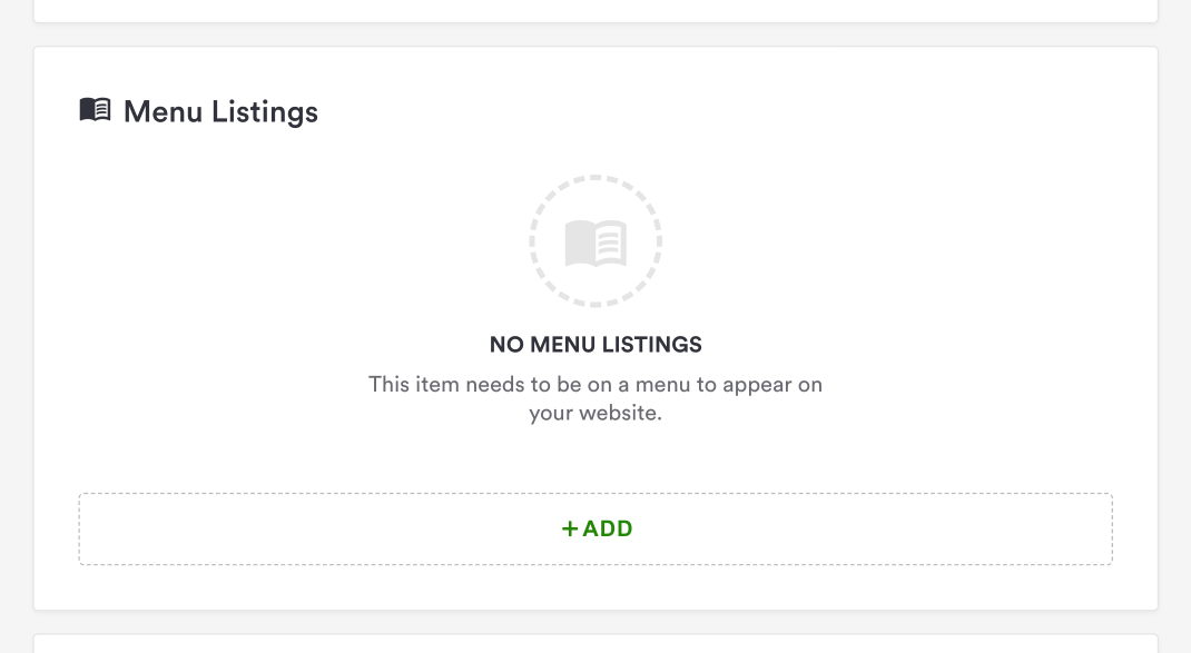 To add items to a menu go to the Menu Listings section, click Add Item, and select the Menu and menu section you want this item to be displayed in. You can also do this when editing or creating a menu in the Menu Detail Page.