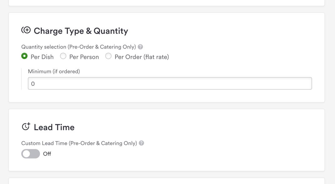 Charge type & Quantity: You can select if you would like the order to be priced per dish, per person, or at a flat rate with no quantity options.