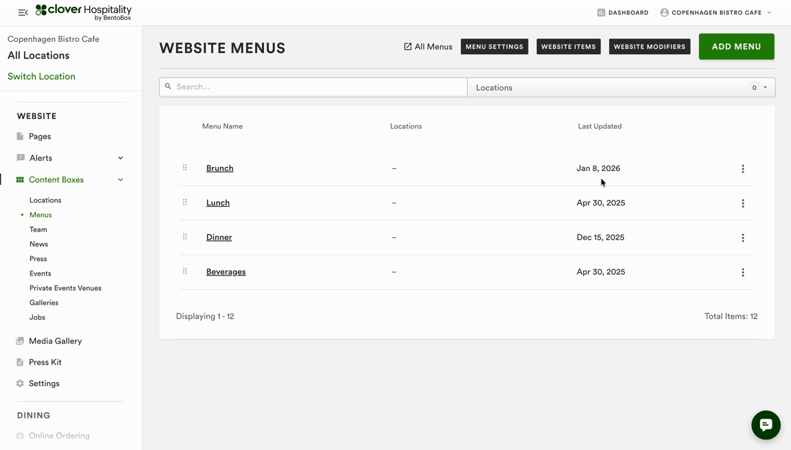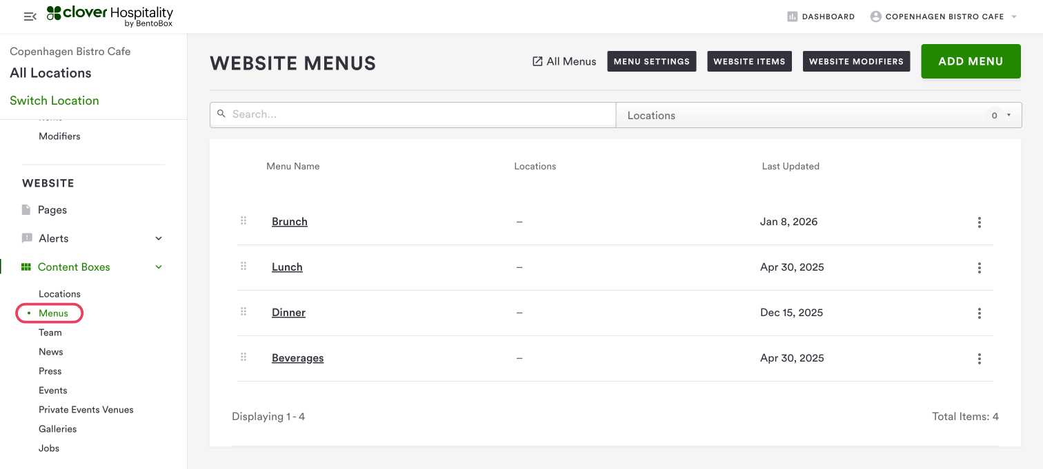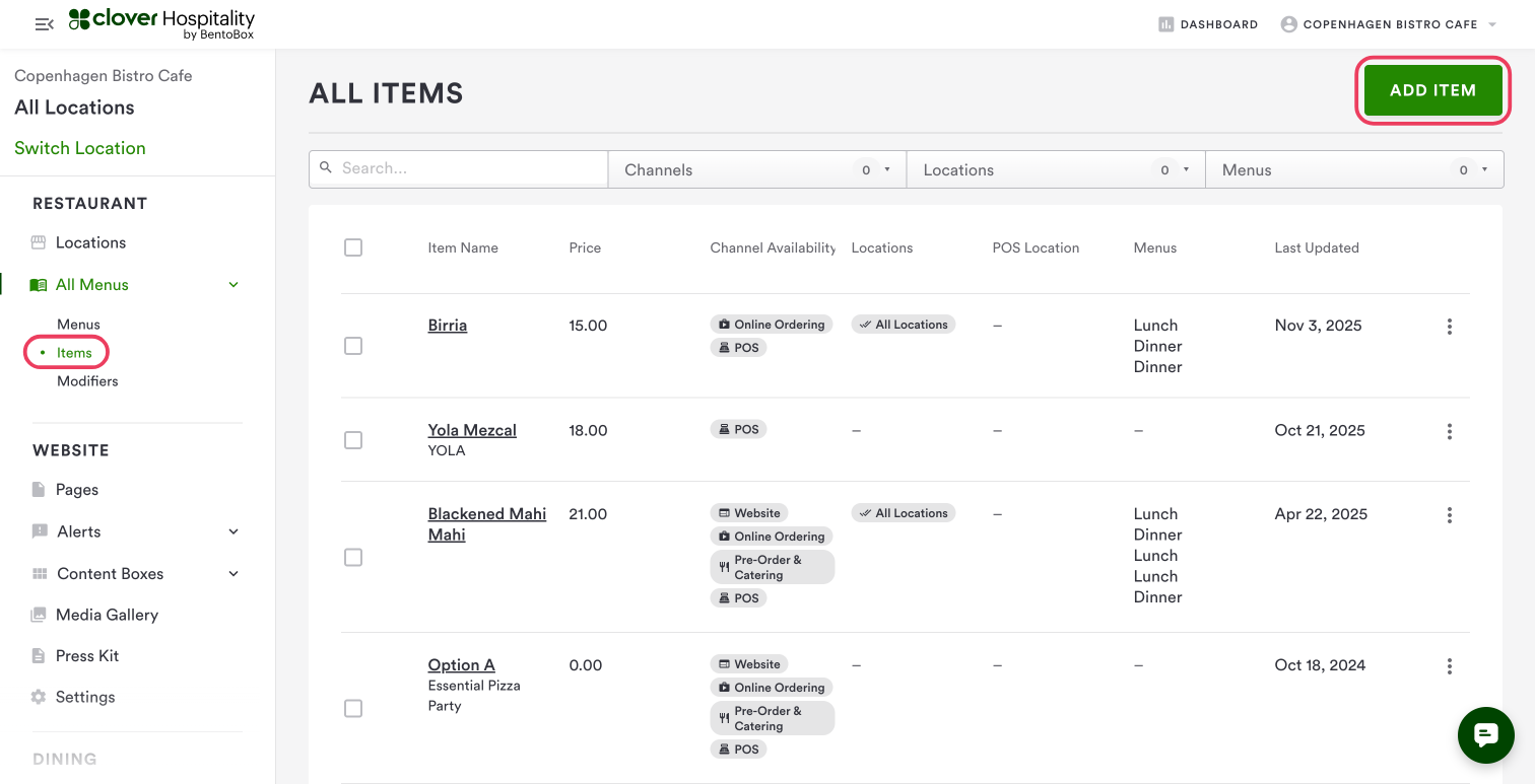 To create a new Menu item, navigate to All Menus > Items on the left-hand navigation.