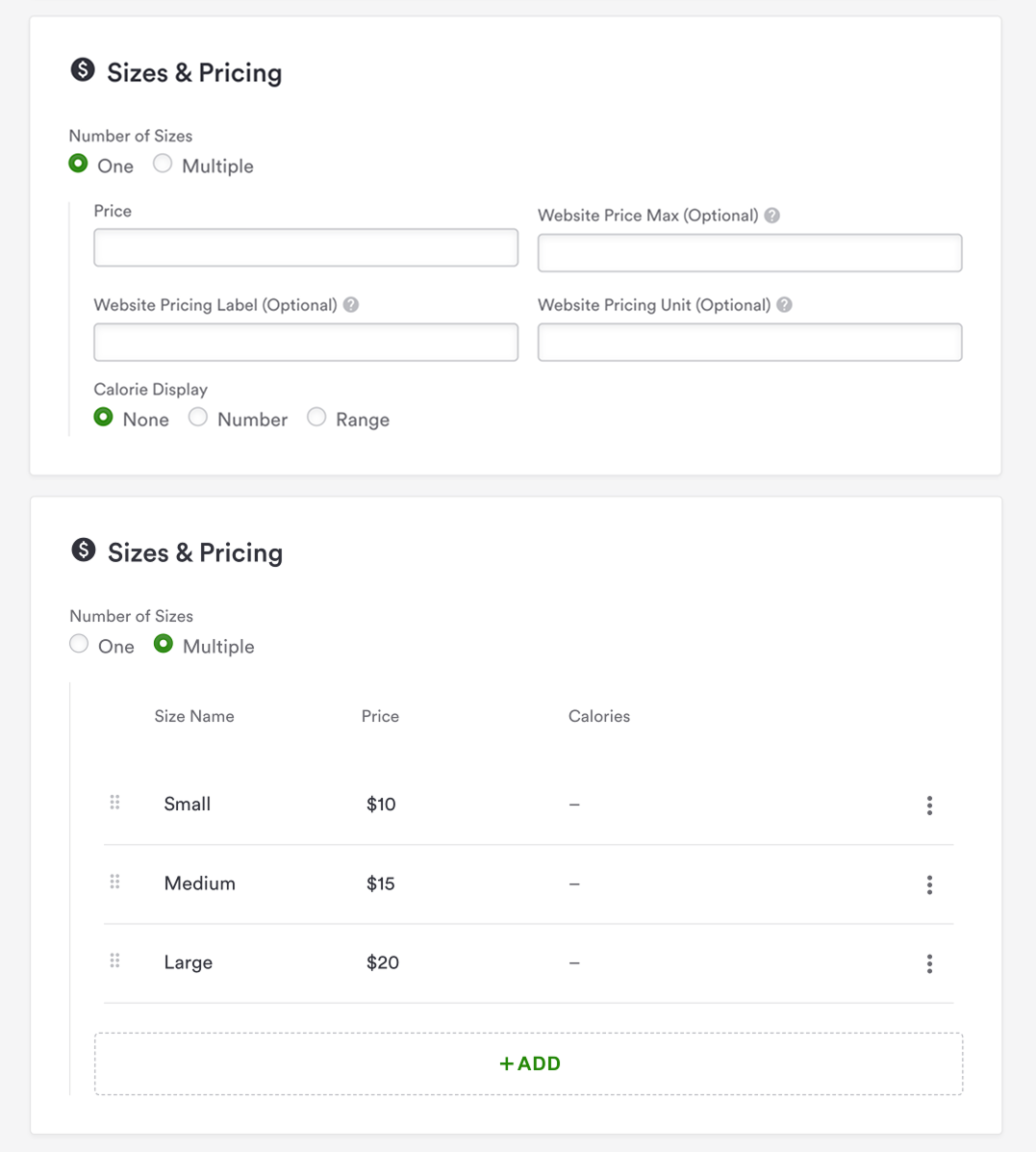 Here you will add your sizing and pricing options for the item. You can either add one flat price for the item, or multiple if the item comes in sizes/flavors, etc. You may also select to display a calorie count here.
