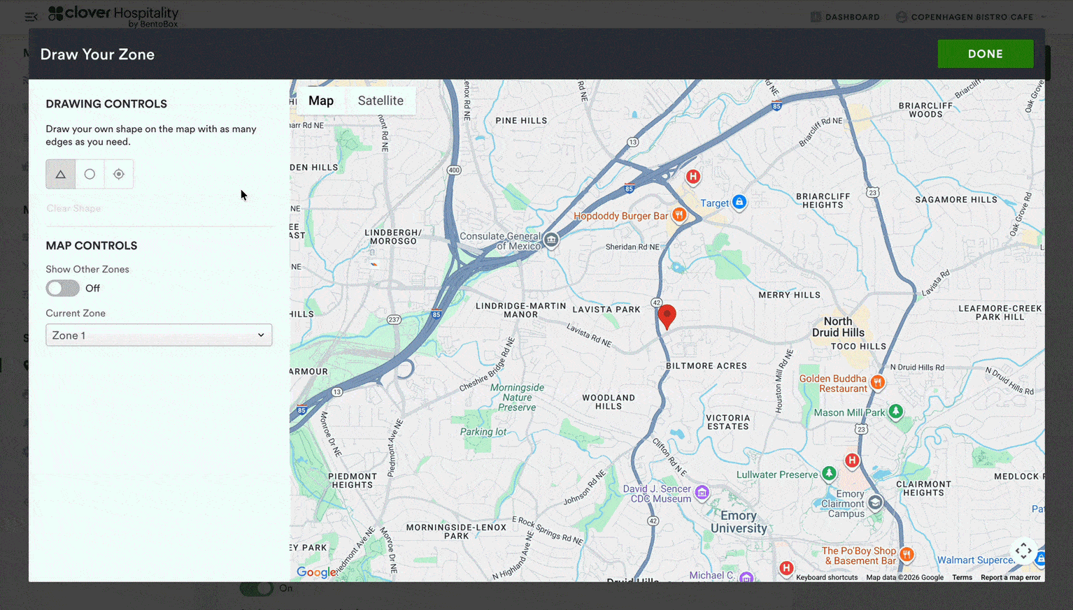 If you staff your own delivery drivers, you can set up your delivery zones and fees for each zone in Clover Hospitality by BentoBox. Once you log in and go to Online Ordering > Locations > edit location, you’ll be able to choose the exact area(s) that you’ll deliver to and set a flat dollar amount or percentage fee per zone. These zones apply at checkout based on the address that your guest types in.