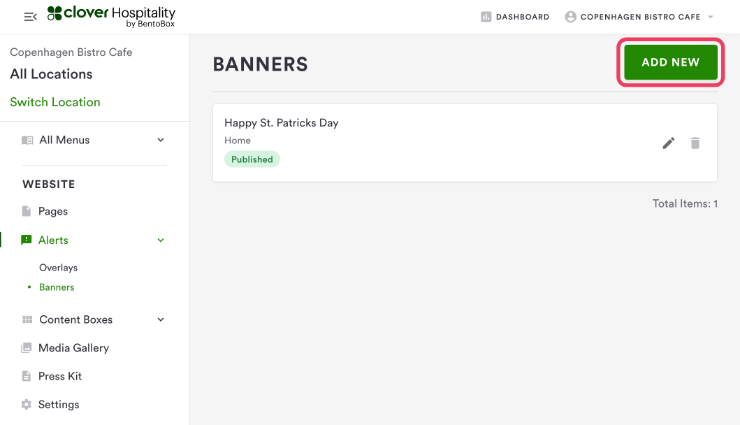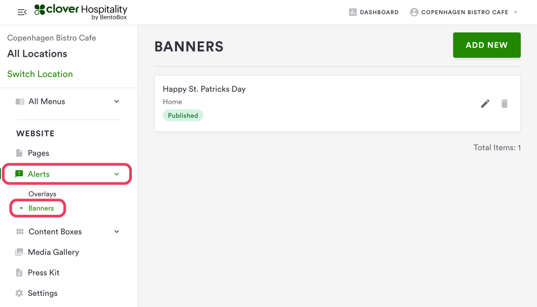 To create a new alert, log in to the backend, click on Alerts, and banner alerts.