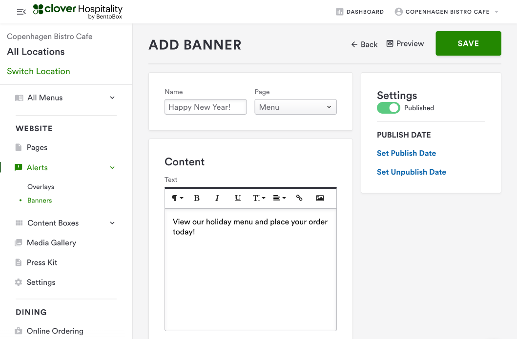 When you have finished editing your alert, move the Publishing toggle to Published if you would like your alert to be live right away or set a publish/unpublish date.(Click here to learn more about scheduling posts.