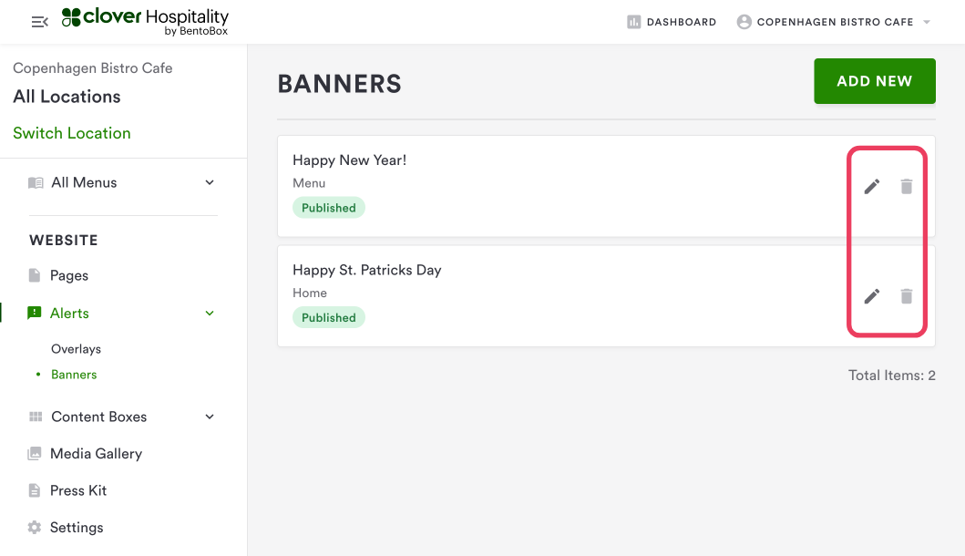 When navigating to Overlay or Banner alerts, you will see a list of your previously added alerts. You can quickly tell if the alert is active and what page it has been added to.